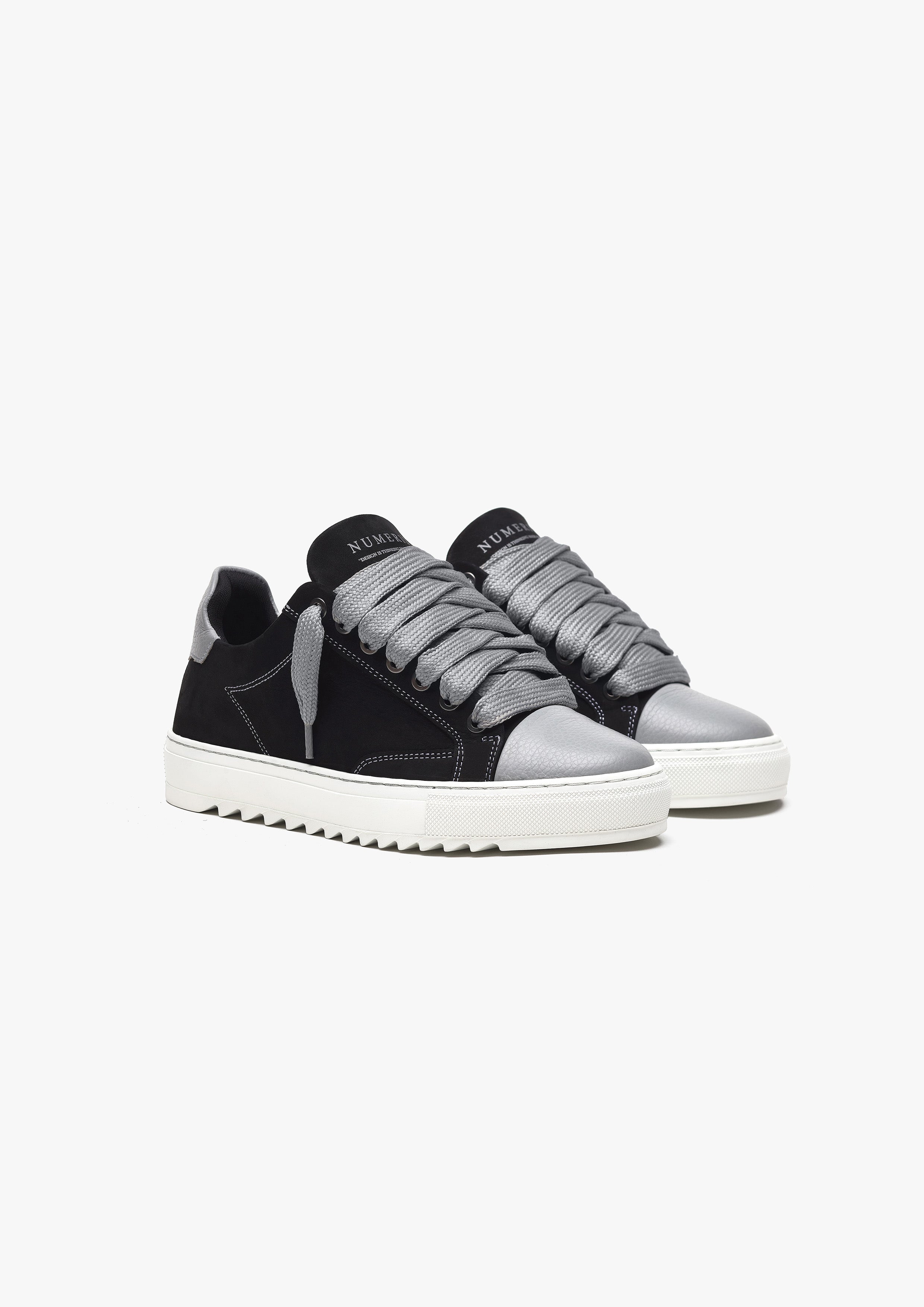 Every stitch and every detail has been carefully designed in a Parisian atelier. The Atelier sneaker features a high-quality black nubuck upper with impeccable white stitching and an iconic grey full-grain leather toe. The interior of the shoe includes a padded collar lining that offers unparalleled comfort. Final details include our Numeriś logo on the heel, accompanied by this model’s slogan, “Design is thinking made visual,” printed on the tongue.